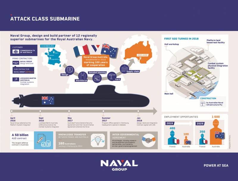 La ministra para las Fuerzas Armadas francesa, Florence Parly, viajó a Australia para firmar un acuerdo de asociación estratégica, o Strategic Partnering Agreement (SPA) con Naval Group, el 11 de febrero de 2019 para la construcción de 12 submarinos de Clase Attack -en el marco del Programa Future Submarine- con su homólogo en aquella nación, el titular de Defensa, Christopher Pyne, que se prolongará en los próximos cincuenta años, en presencia del primer ministro, Scott Morrison. Se enmarcó también una cooperación operativa en el área de los océanos Índico y Pacífico. La proximidad entre los dos países se expresó por primera vez durante la I Guerra Mundial. Además de la entrega de los 12 sumergibles avanzados, se proporcionarán nuevas tecnologías y capacidades de fabricación avanzadas a Australia, que le permitirá entrar en una fase superior de soberanía en este ámbito y la creación de miles de puestos de trabajo directos e indirectos allí.