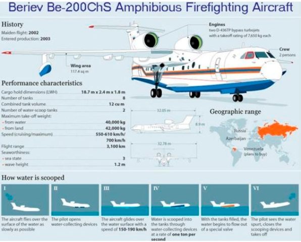 El aparato puede cargar hasta 12 Tn. de agua en sus ocho depósitos bajo el fuselaje y los puede lanzar de una sola tacada en 14 segundos o en ocho descargas individuales. Además puede montar otros seis tanques auxiliares con retardantes para el fuego. Este avión tiene algunas soluciones ingeniosas como los dos motores D-436TP turbofán preparados para soportar la corrosión del agua de mar y que van montados en la parte superior trasera del avió para prevenir que entre agua en las turbinas.
