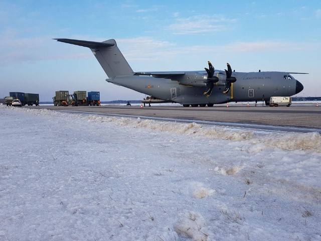 El segundo A400M entregado al Ala 31, llegaba el 6 de marzo a la Base Aérea de Torrejón desde su sede, la Base Aérea de Zaragoza. Una vez en Madrid, el aparato fue cargado, incluyendo posiblemente munición, dado que la operación se realizó en la zona resguardada para tales efectos, despegando posteriormente a las 9:48 (“hora zulu”, una más que en España). La aeronave turbohélice cubrió los 2.712 kilómetros, en línea recta, que separan la capital de España y la de Letonia, en sólo 4:05 horas, tomando tierra en el nevado aeropuerto Internacional de Riga, sito en Mārupe unos 10 km al suroeste de la capital baltica, a las 13:53 “hora zulu”. Se ha de tener en cuenta que es casi el mismo tiempo que tiene programado, 3:55 minutos, el reactor comercial Bombardier CS300 de Air Baltic que une el aeropuerto de Madrid-Barajas con el de Riga.