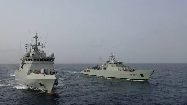 Fotografia: El BAM “Furor” (ala izquierda) navegando en aguas del golfo de Guinea junto al “Setúbal”. (foto EMAD)
