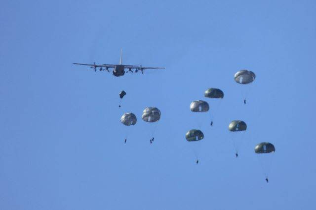Uno de los Hercules participantes lanzando paracaidistas sobre Caudé (Teruel). Foto: Javier Ballesteros.