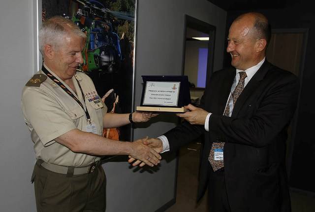 Durante el acto celebrado en Le Bourget, el presidente de NH Industries ha puesto de manifiesto la proyección de futuro que otorga el NH90 al Ejército español momentos antes de entregar las dos placas al teniente general García Montaño, que ha elogiado el nuevo “caballo de batalla” con el que se está dotando el ET.