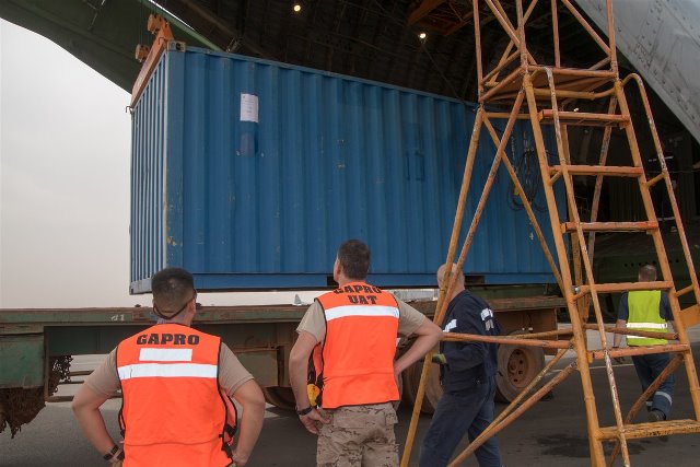 ·Miembros del GAPRO sacando un contenedor del An-124- Foto: EMAD.