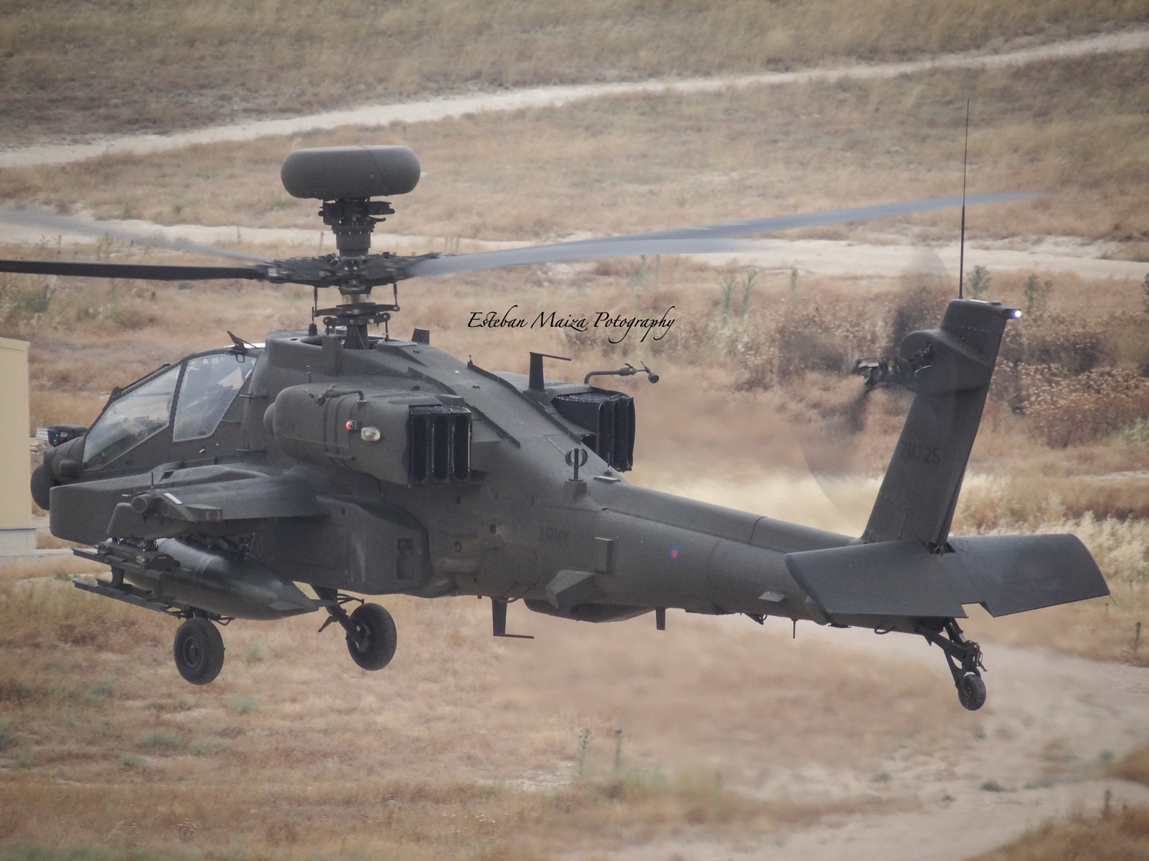 Foto apertura: Dos helicópteros de ataque AH-64E Apache Guardian del Ejército Británico ejecutando una toma en polvo en el CENAD de San Gregorio. (foto: Esteban Maiza)