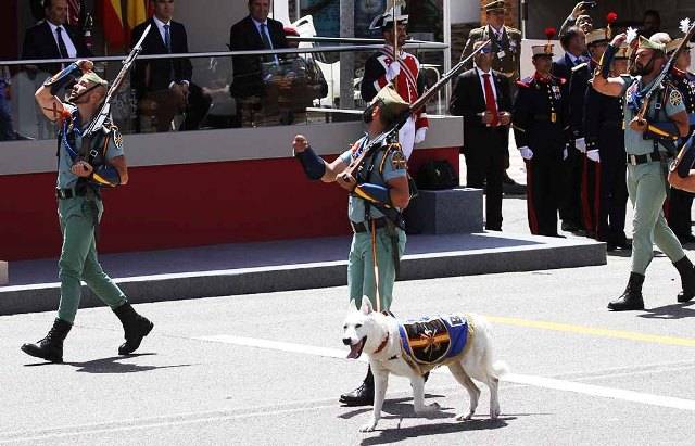Cerraron el desfile las dos unidades del Ejército de Tierra con paso específico de 160 y 90 pasos por minuto respectivamente. En primer lugar pasó miembros de la Legión, en concreto pertenecientes a la Brigada “Rey Alfonso XIII” II de la Legión, a los que como mascota, en vez del habitual carnero, los acompañaba un perro pastor blanco, llamado Tom, que, al igual que el que participó en la formación a pie de la UME, cumplió disciplinadamente su participación en el desfile. La última formación a pie fue la del personal del Grupo de "Regulares de Ceuta" nº 54, muy aplaudidos por los miles de espectadores situados a lo largo del kilómetro y medio de recorrido del desfile. (Julio Maíz Sanz)