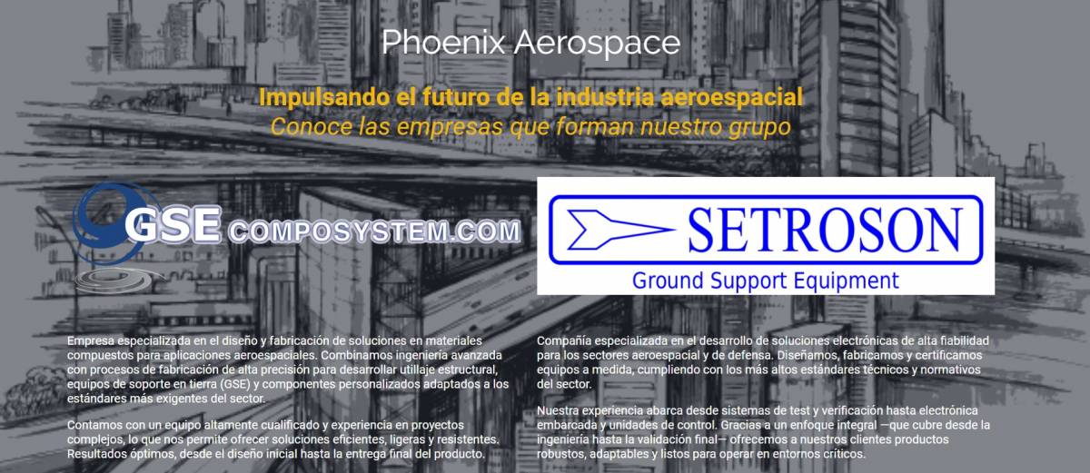 Ahora se ha anunciado la integración de dos veteranas compañías españolas del sector de fabricación aeronáutica y equipos de apoyo en tierra como son GSE Composystem y Setroson en Phoenix Aerospace, creada en 2022 como el holding financiero Phoenix Rise Capital y que cambió su denominación el pasado 12 de marzo a la actual denominación Phoenix Aerospace.