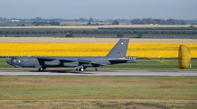 Fotografia: Uno de los B-52H desplegados en España, ya rodando en la base de Morón, reduciendo su velocidad con ayuda de un paracaídas. (foto USAF)
