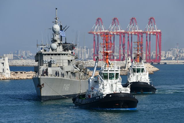 La fragata griega “Kountouriotis” entrando en Haifa, con la ayuda de los remolcadores israelíes. (foto SNMG2)