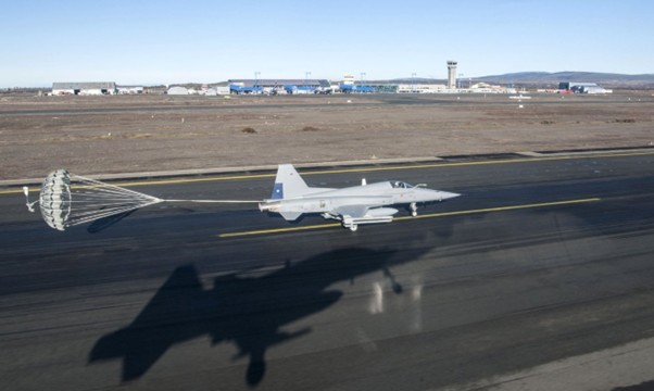 F-5 Tiger III de la Fuerza Aérea de Chile (FACh) con su paracaídas de frenado desplegado (autor)