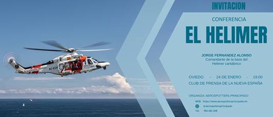 El próximo viernes, 24 de enero, la asociación AeroSpotters Principado organiza una charla impartida por el comandante de la base del helicóptero de Salvamento Marítimo, Helimer, basado en Gijón. El comandante, Jorge Fernández Alonso, explicará en que consiste el servicio que presta el Helimer.