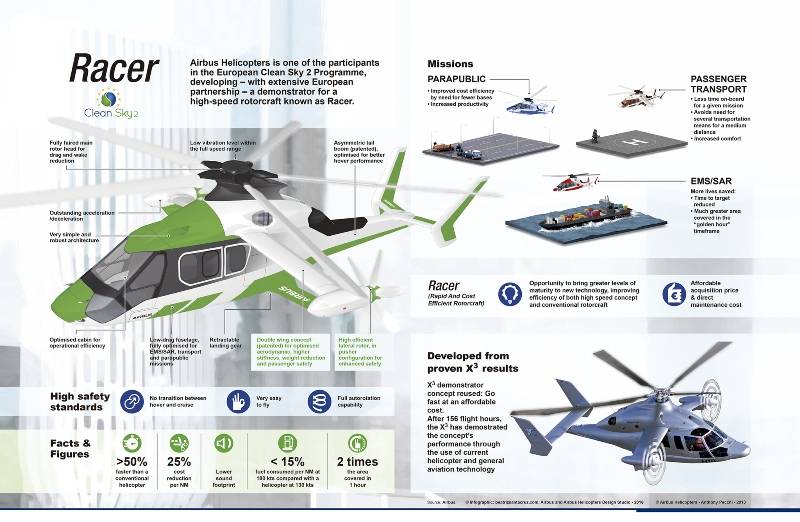 El proyecto Racer se basa en los éxitos obtenidos con el demostrador X3, financiado con fondos propios, que confirmó la validez de la configuración aerodinámica "híbrida" de helicóptero combinando el tradicional rotor principal y dos innovadoras hélices laterales. El proyecto Racer acercará ese concepto a un diseño operativo y demostrará su idoneidad para un amplio espectro de misiones en los que su mayor velocidad y eficiencia aportarán un considerable valor añadido, tanto para los ciudadanos como para los operadores: servicios médicos de emergencia y de operaciones de búsqueda y salvamento – además de los servicios públicos, transporte aéreo comercial y aviación privada y de negocios.