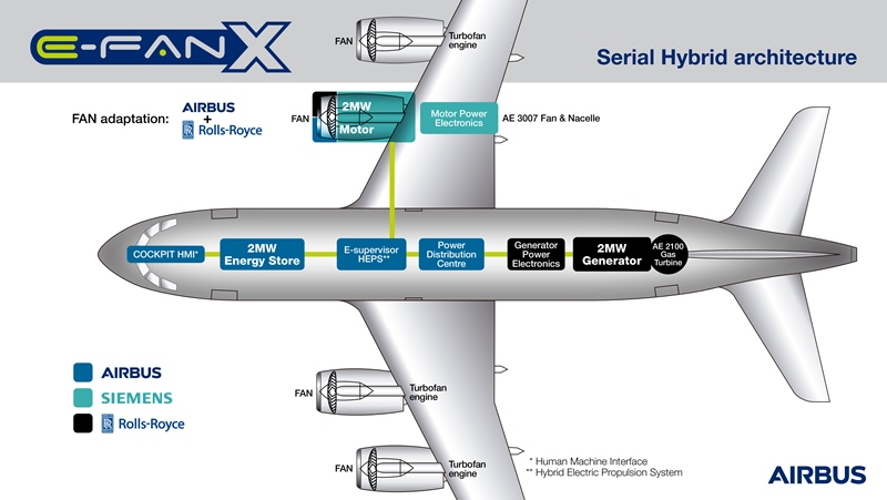 Airbus, el motorista Rolls-Royce y Siemens se han asociado para desarrollar a corto plazo el demostrador de vuelo “E-Fan X”, un paso significativo en la propulsión híbrida eléctrica para aeronaves comerciales. Se prevé que esté listo en 2020, siguiendo una amplia campaña de ensayos en tierra y en un banco de ensayos en vuelo a bordo de un BAE Systems BAe 146, con una de sus cuatro turbinas sustituida por un motor eléctrico de 2 mW.