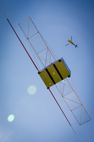 Debido al rango de frecuencias que se requiere, estos ensayos deben realizarse en el exterior y, por ello, se ven afectados por perturbaciones externas, reflexiones electromagnéticas y las condiciones meteorológicas generales. Como la nave espacial real no puede sacarse al exterior, se ha construido una maqueta especial de 3 m x 2 m x 2 m para montar sobre ella la antena. La posibilidad de rotar verticalmente la antena minimiza la posibilidad de acoplamiento externo. La maqueta voló colgada de un helicóptero por medio de una cuerda de polietileno de unos 120 m de longitud y a 320 m de altura. Todos los equipos de prueba se integraron en la maqueta y se manejaron por control remoto desde el suelo.
