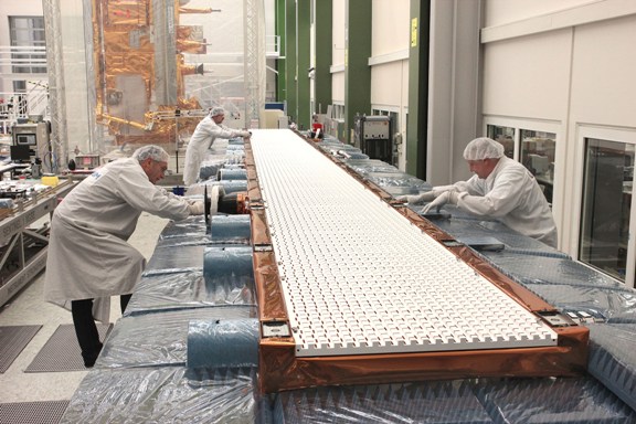 El instrumento SAR de Sentinel-1, que fue construido por Astrium en Friedrichshafen, está equipado con una antena de guía de ondas, que consiste en 560 antenas individuales conectadas entre sí. Astrium en Portsmouth (Reino Unido) suministró la electrónica SAR conectada a ésta. La antena activa se puede orientar electrónicamente al área que se va a explorar sin tener que moverla físicamente. Con ayuda de esta tecnología se puede hacer un barrido simultáneo de varias “franjas” adyacentes, que se combinan a continuación para obtener una perspectiva general.