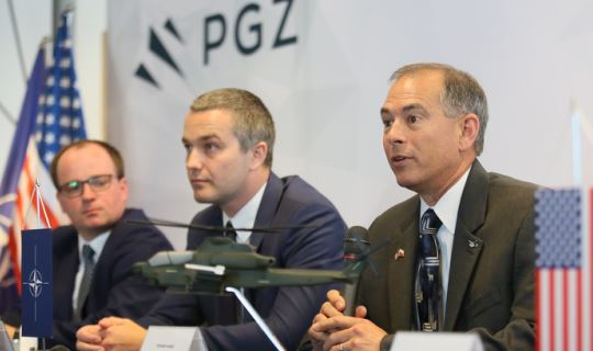 Foto: El vicepresidente de Negocio Militar Internacional de Bell Helicopter, Rich Harris (a la derecha), con representantes de PGZ.