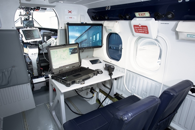 Puesto de trabajo de ISR en la cabina de pasajeros de uno de los DHC-6-400 transformados para tareas de ISR.