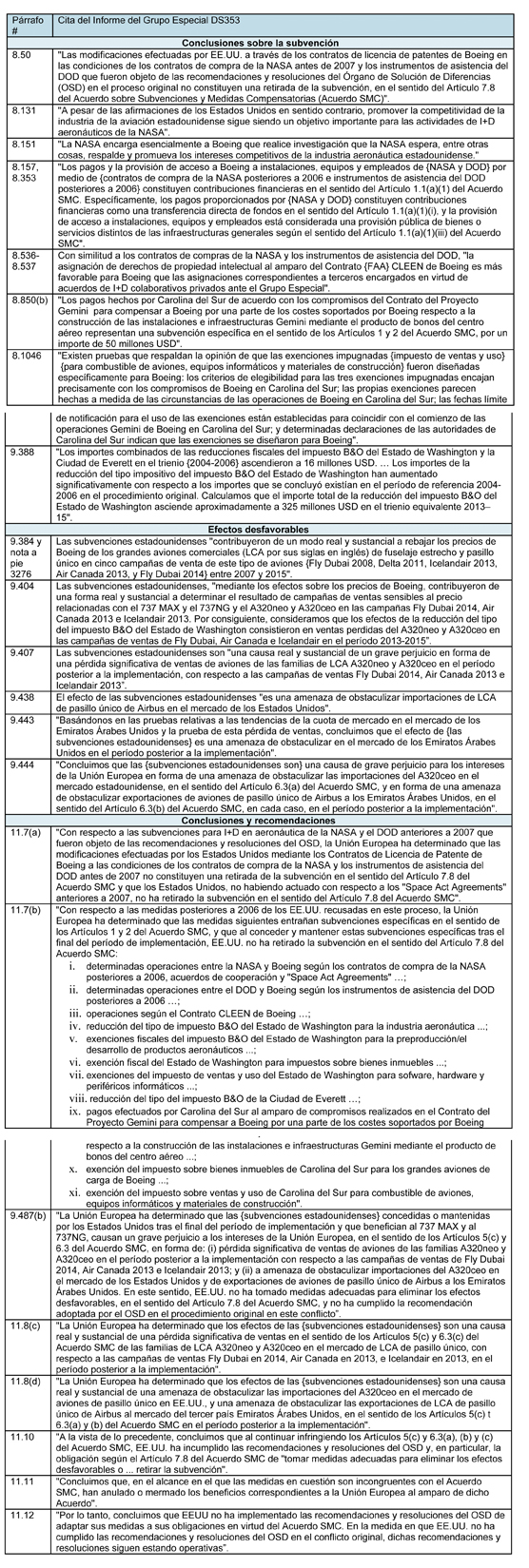 El Grupo Especial ha determinado que las subvenciones no retiradas continúan causando efectos desfavorables en forma de una significativa pérdida de ventas para Airbus. En particular, ha concluido que las reducciones fiscales del impuesto B&O (Business & Occupation) del Estado de Washington hicieron que Airbus perdiera al menos 16.000 millones de dólares en ventas a favor de Boeing. Esta conclusión podría llevar en última instancia a la imposición de sanciones comerciales contra Estados Unidos por valor de miles de millones de dólares. Se espera que la resolución de hoy sea objeto de apelación. Sin embargo, no hay ninguna indicación de que los argumentos de Estados Unidos vayan a ser diferentes de los presentados anteriormente, pese a la clara posición de la OMC.