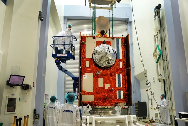 El satélite de observación de la Tierra Sentinel-6A se está probando a todo volumen. Los ingenieros espaciales de Airbus están “bombardeando” con sonido al satélite más reciente del programa europeo de medioambiente y seguridad “Copernicus” dentro de una cámara especial del Centro de Pruebas Espaciales de Industrieanlagen-Betriebsgesellschaft mbH (IABG) en Ottobrunn, cerca de Múnich. La prueba de ruido acústico simula el impacto sonoro al que se verá sometido el satélite durante el lanzamiento del cohete.