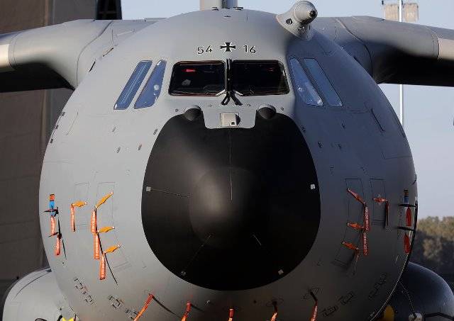 Fotografía: Imagen frontal del nuevo A400M de la Luftwaffe, el 54+16. Foto: Airbus DS-San Pablo (Sevilla).