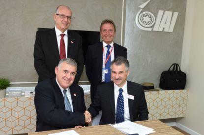-Carl Esposito (sentado a la derecha), presidente de Sistemas Electrónicos de Honeywell Aerospace, y Boaz Levi, vicepresidente Ejecutivo y drector general de Sistemas Misiles y Espacio de IAI; y de pie James Bryson, presidente para Europa, Oriente Medio, África e India de Honeywell Aerospace, y Joseph Weiss, presidente de IAI.
