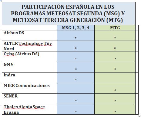 Un total de siete empresas nacionales -Airbus DS, Alter Technology Tüv Nord, Crisa, GMV, Indra, SENER, Thales Alenia Space España- han aportado sistemas y equipos a la flota MSG, situándose la participación española en el 7 % del total de la misión Meteosat Segunda Generación. Último de su generación, MSG-4, desarrollado para la Agencia Espacial Europea (ESA) y EUMETSAT (Organización Europea de Satélites Meteorológicos), proporcionará datos meteorológicos y de monitorización del clima en toda Europa desde su posición en órbita geoestacionaria a 36.000 kilómetros sobre el ecuador, a 3,4º oeste de longitud. MSG-4 es el cuarto de una serie de cuatro satélites de segunda generación, y se unirá a los satélites MSG-1, MSG-2 y MSG-3, lanzados con éxito en agosto de 2002, diciembre de 2005 y julio de 2012.