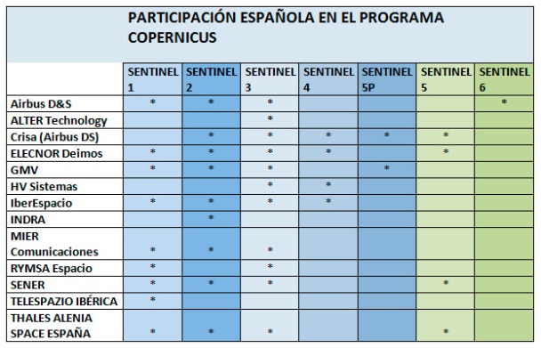 Las empresas de TEDAE que han participado en los dos satélites Sentinel-2 han sido Airbus DS, Crisa, Elecnor Deimos, GMV, IberEspacio, Indra, MIER Comunicaciones, Sener, y Thales Alenis Space España. Pero, en total, son 13 las empresas nacionales implicadas en toda la misión COPERNICUS y la aportación española global se puede cifrar en un 6 %, una misión liderada por la Comisión Europea en colaboración con la Agencia Espacial Europea (ESA), cuyo objetivo es proporcionar a los ciudadanos europeos información precisa, puntual y accesible para mejorar la gestión del medioambiente y para comprender y mitigar los efectos del cambio climático, a la par que se asegura el control terrestre, la gestión de emergencias y la seguridad.