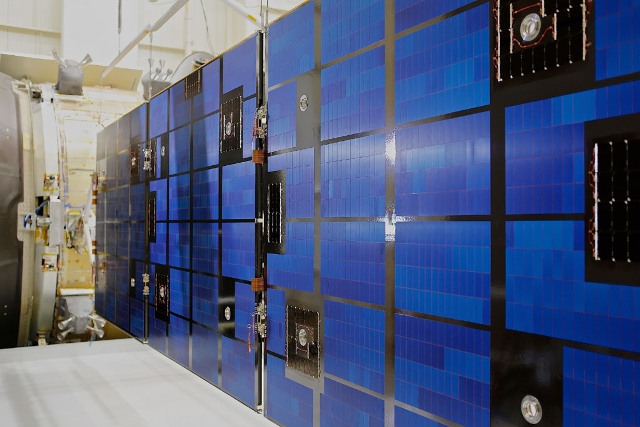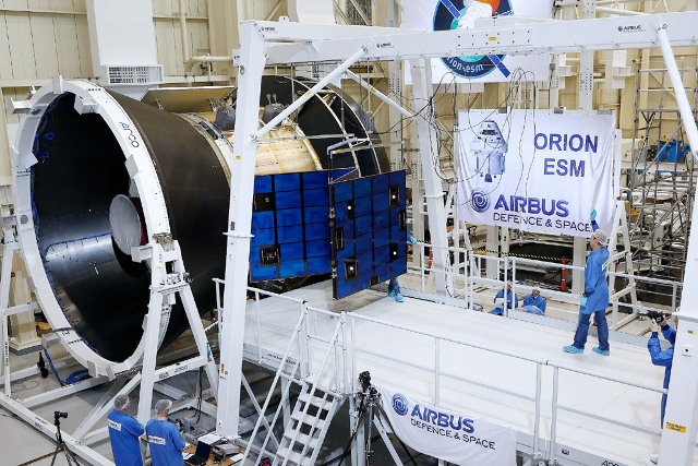 Los modelos de vuelo de los paneles solares ya se están construyendo con el objetivo de suministrar el primer módulo ESM a principios de 2017. El conjunto de paneles solares –que pesa en total 260 kilogramos– está formado por cuatro alas y, a su vez, cada ala por tres paneles de 1.242 células de arseniuro de galio cada uno. Las casi 15.000 células suministrarán en total a la cápsula Orion 11,1 kW para desarrollar su misión.