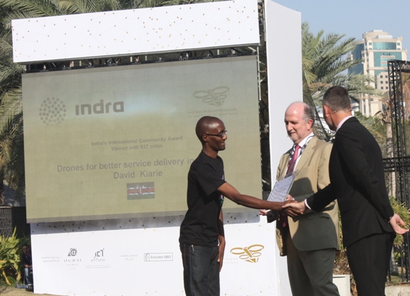 El autor de la propuesta "Drones for better service delivery in slums", David Kiarie, de Kenia, recibió el premio “De la idea a la realidad”, patrocinado por Indra, en la final en Dubái de manos del director de Innovación y Alianzas de la multinacional tecnológica, José Luis Angoso, y el director de la filial de Indra en Emiratos Árabes Unidos, Alejandro Moya. El keniano se alzó con el premio después de obtener 937 votos en la plataforma de Open Innovation, iParticipa, habilitada por Indra para el concurso. En total, se registraron 4.735 usuarios y 4.652 votos, y las ideas recibieron más de 55.000 visitas y 500 comentarios.