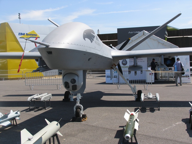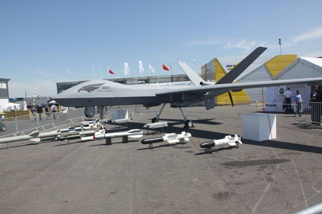 01-El MALE de AVIC Wing Loong mostrado en el salón de Le Bourget con su amplio sustido de armas nos recuerda mucho al Raper MQ-9 norteamericano.