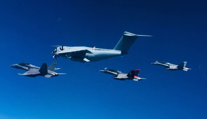 -Imagen del A400M de la TUDM repostando a varios F/A-18D. Foto: TUDM.