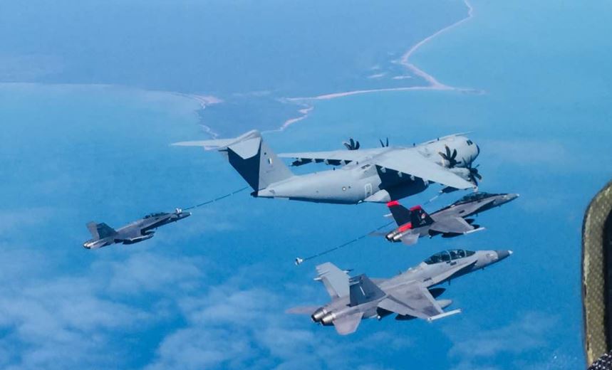 El último de los A400M encargados llegaba en marzo de 2017 a la base aérea de Subang, en las cercanías de la capital, Kuala Lumpur, donde se incorporará al 22 Squadron de la TUDM. Poco más de un año después ya se puede ver que la Real Fuerza Aérea de Malasia, la TUDM (Tentera Udara Diraja Malaysia), ha entrenado y certificado que las tripulaciones de sus A400M puedan repostar a otras aeronaves en el aire. En las fotos obtenidas durante el ejercicio “Pitch Black” 2018 se puede ver a uno de éstos aparatos repostando en el aire a una formación de cazabombarderos F/A-18D Hornet también malayos.
