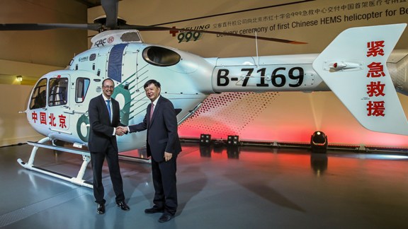 (defensa.com) Con la entrega de un helicóptero bimotor EC135 de Airbus Helicopters – primer aparato destinado a misiones de servicios específicos sanitarios de urgencia en helicóptero (HEMS, por sus siglas en inglés) del país -comienza una nueva era en las operaciones de aeroambulancia de China. La ceremonia de entrega se celebraba en la sede de Airbus Helicopters en Donauwörth – la planta alemana de ingeniería y producción en la que se ha efectuado el montaje del helicóptero – , el aparato sienta un hito para el Centro de Socorro de Urgencia 999 (Centro 999), filial de la Fundación de la Cruz Roja de Pekín.