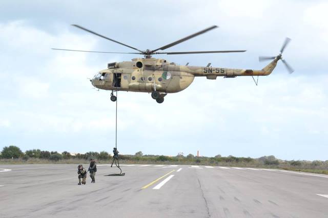 ·Uno helicóptero argelino realizando un simulacro de asalto aéreo. Foto: Ministerio de Defensa de Argelia.