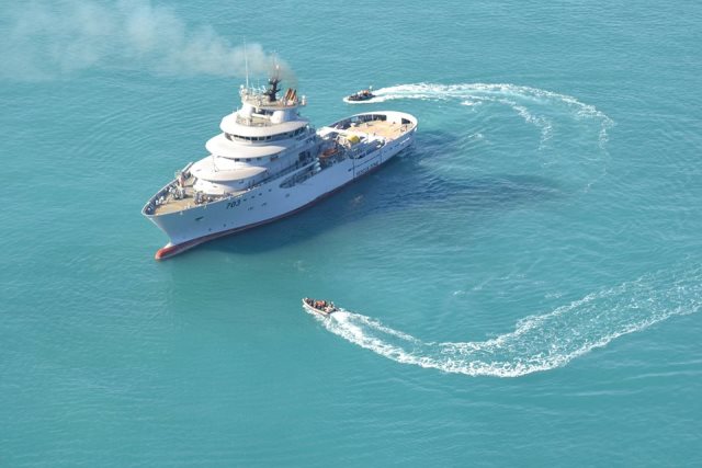 ·El remolcador de altura de la Marina Militar de Argelia “El Moussanid”, a punto de ser “asaltado” por dos lanchas semirrígidas. Foto: Ministerio de Defensa de Argelia