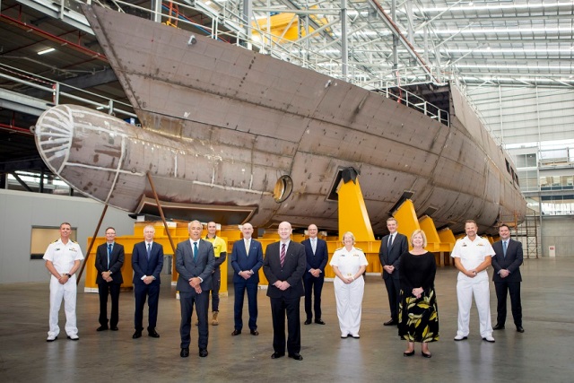 Presentación de la empresa OPV “Arafura” en Henderson, en el centro (con corbata roja y rallas) se ve al secretario de Defensa de Australia Greg Moriarty. (foto DD de Australia).