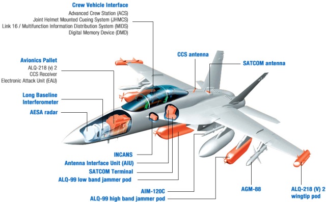 El EA-18G Growler está basado en el F/A-18 Super Hornet que la RAAF ha adquirido en número de 24 unidades y al que acompañará en su misión de protección electrónica, perturbación o jamming táctico. Sustituye al Grumman EA-6B Prowler en la Navy y se trata actualmente del único avión de este tipo en producción. Los avanzados equipos electrónicos incorporados al avión le permiten realizar misiones de apoyo electrónico en las que puede actuar perturbando, engañando o negando el uso de sistemas electrónicos del adversario como los de comunicaciones o los radares. Entre estos equipos están receptores de radio mejorados, sistemas de comunicaciones capaces de funcionar en un espacio electromagnético saturado, comunicaciones por satélite o perturbadores de alta y baja frecuencia de la familia ALQ montados bajo el fuselaje y las alas del avión. A pesar de las avanzadas cualidades de esta aeronave Boeing no tiene nuevos pedidos actualmente por lo que si estos no llegan, se cerrará la cadena de montaje del Growler y también la del Super Hornet a finales de 2.017. (J.N.G.)