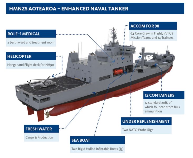 El HMZNS Aotearoa reemplazará al petrolero de flota HMNZS Endeavour que fue dado de baja el pasado mes de diciembre tras treinta años de servicio. Con un desplazamiento de 26.000 toneladas el Aotearoa triplica la capacidad del buque al que sucede. El buque tendrá una eslora de 173,2 metros, una autonomía de 6.750 millas náuticas, una velocidad de 16 nudos y una tripulación de 64 personas aunque tendrá acomodo para 100.