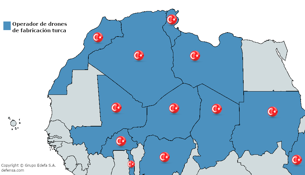 Turquía y China han surgido como proveedores clave de drones militares para los países de la región, Aviones como el Bayraktar TB2 y el ANKA turcos, que son drones de combate de Altitud Media y Larga Autonomía, MALE, junto con otros drones turcos como el Akinci, más avanzado, de Gran Altitud y Larga Autonomía, HALE, se han convertido en un elemento esencial en los arsenales de Malí Burkina Faso Níger y Chad, además de drones chinos como el BZK-005, MALE, adquirido por Mauritania.
