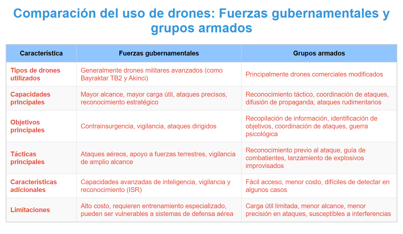 Por el contrario, los grupos armados han demostrado una notable capacidad para adaptarse a esta tecnología y explotarla. Después de limitar inicialmente el uso de drones comerciales simples a tareas de reconocimiento y planificación de ataques y emplearlos como una herramienta eficaz en la guerra psicológica y la propaganda mediante la filmación y difusión de videos de operaciones el desarrollo más peligroso ha sido su uso como arma ofensiva.