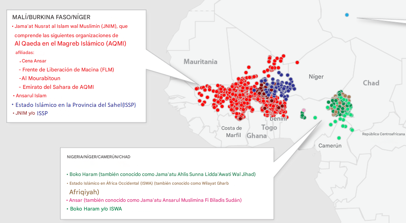 Además, el grupo Boko Haram, de origen nigeriano, tras resurgir con fuerza alrededor de 2011 juró lealtad al Estado Islámico en 2015 para convertirse en la Provincia de África Occidental ISWAP y expandió su influencia a Níger. Desde 2017, la violencia ha aumentado significativamente con la expansión del alcance de las operaciones del GSIM y el EIGS en la región de Liptako-Gourma, fronteriza entre Malí Burkina Faso y Níger, lo que representa una amenaza creciente para los países costeros de África Occidental,