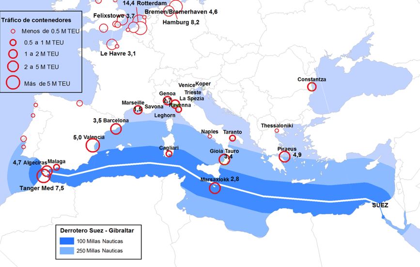 España, como parte del espacio mediterráneo, se ve directamente afectada con la posibilidad de congestión adicional en sus puertos, las conexiones hacia el centro peninsular están basadas en la fachada marítima de Levante y en esta situación la debilitada red sur de ferrocarril se convierte en una necesidad estratégica.
