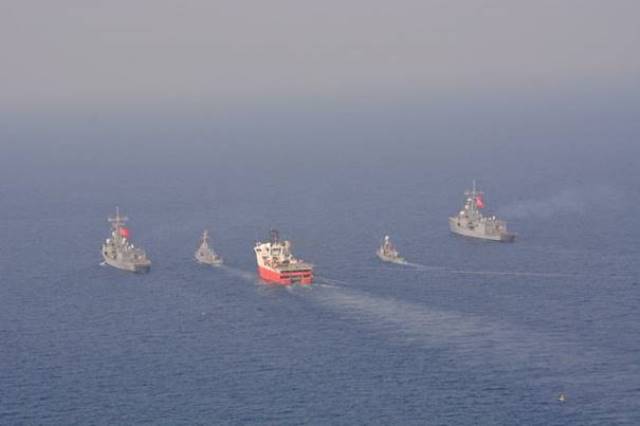 ·La nave sísmica de Barbaros acompañada por las fragatas de protección naval turcas.