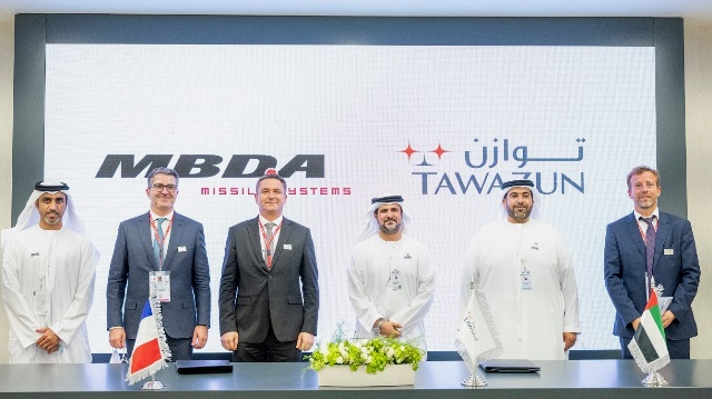 Firma del acuerdo entre Matar Ali Romaithi, director de la Unidad de Desarrollo Económico de Tawazun y Florent Duleux, director de ventas de exportación del grupo en MBDA en presencia de Tareq Abdulraheem Al Hosani, director ejecutivo de Tawazun y Eric Béranger, director ejecutivo de MBDA. (MBDA)