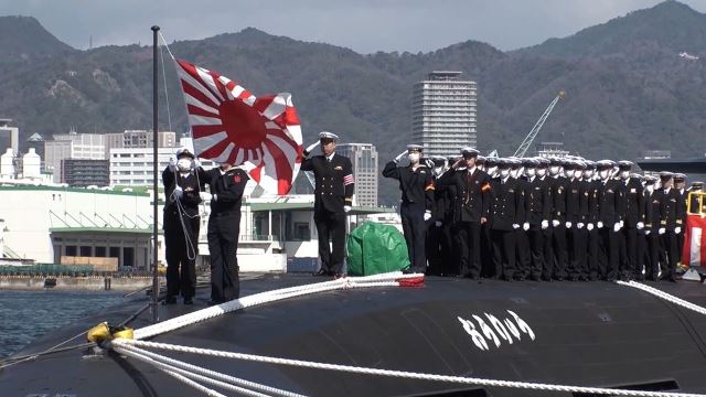 Fotografía: Acto de entrega del JS Ōryū (SS-511). Se aprecia la presencia de mascarillas en la tripulación del submarino (JMSDF)