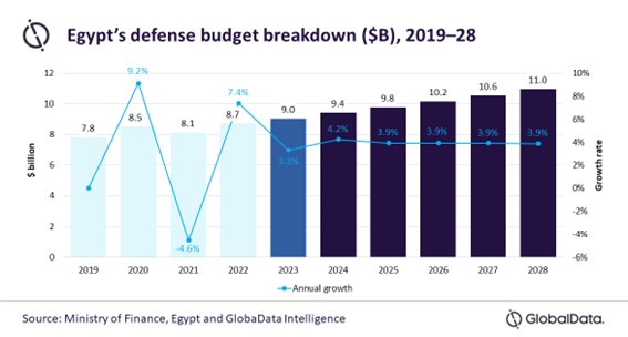 Según los datos disponibles, el presupuesto destinado a defensa por Egipto para el ejercicio 2023 serán 9.400 millones de dólares, previendo la consultora un crecimiento continuado del 3,9 % en los próximos cinco años, de tal manera que en 2028 alcance los 11.000 millones de dólares.