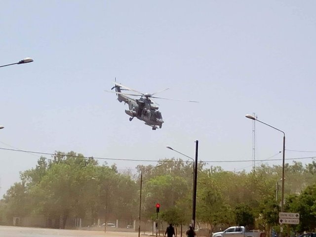 ·Un Caracal en vuelo estacionario en la cercanías de la Embajada de Francia en Burkina Faso. Foto: Radiodiffusiion Télévision du Burkina