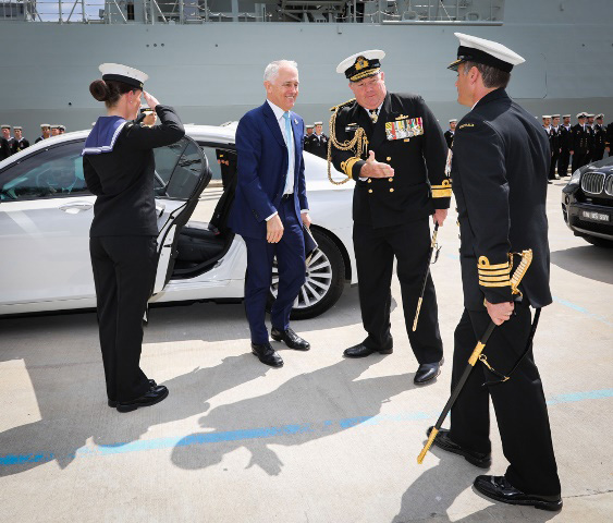 ·El Primer Ministro de Australia, Malcolm Turnbull es recibido por el Comandante de HMAS Hobart, el Capitán John Stavridis durante la ceremonia de puesta en marcha de HMAS Hobart celebrada en Garden Island, SydneY (RAN)