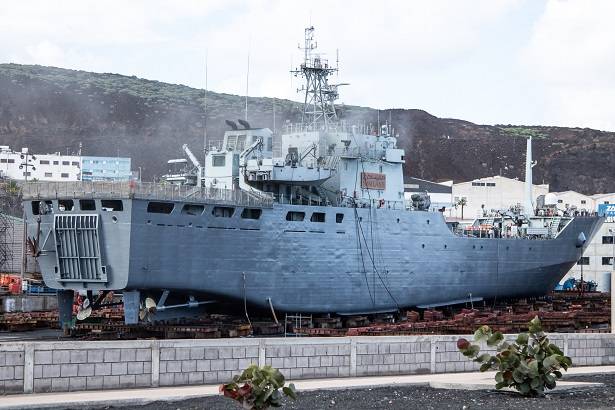 Coincidiendo con la presencia de este LST en el puerto canario, se ha visto también en un punto cercano al patrullero mauritano “Limam el-Hadrami” (P 601), también construido en China, y entregado a la Marina Nacional de Mauritania en 2002. (Julio Maíz Sanz)