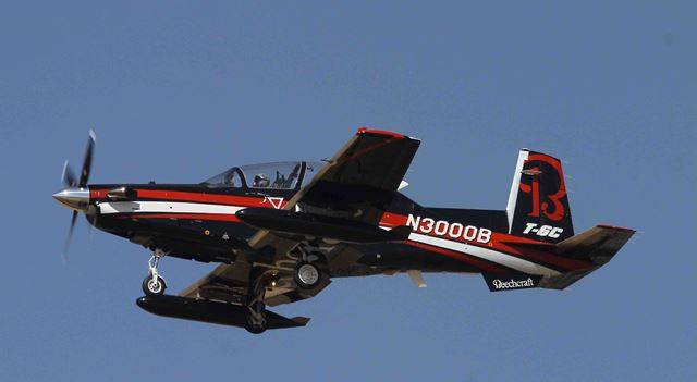 Fotografía: Un Beechcraft T-6 Texan II durante sus pruebas en España por parte del Ejército del Aire. (foto Julio Maíz/defensa.com)