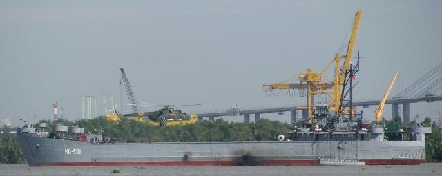 Un helicóptero Mil-8/17 pasa por delante del LST